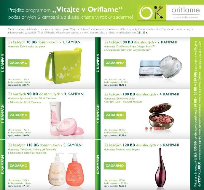 Ak sa novozaregistrovaný poradca nezapojí už v prvej kampani do Programu "Vitajte v Oriflame" stratí nárok na darčeky z tohto programu.
